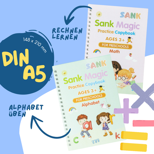 Magnetladen🧠✨ Magic exercise book for children – set of 4 for writing, arithmetic, painting & spelling Learning with magic effect! This high-quality magi...