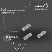 Die vernickelte Oberfläche (Ni-Cu-Ni) schützt zuverlässig vor Korrosion und erhöht die Haltbarkeit der Magnete.